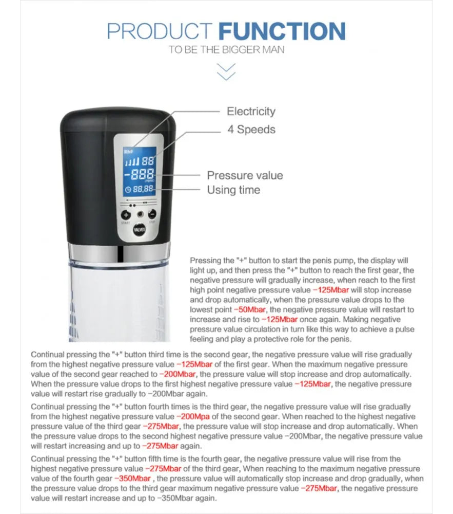 4. Uso consciente: recomendamos sesiones diarias de 10 minutos. Si siente molestias, interrumpa y continúe al día siguiente. Mejore su placer y confianza con este extractor de pene eléctrico, cuidadosamente diseñado para satisfacer sus necesidades.