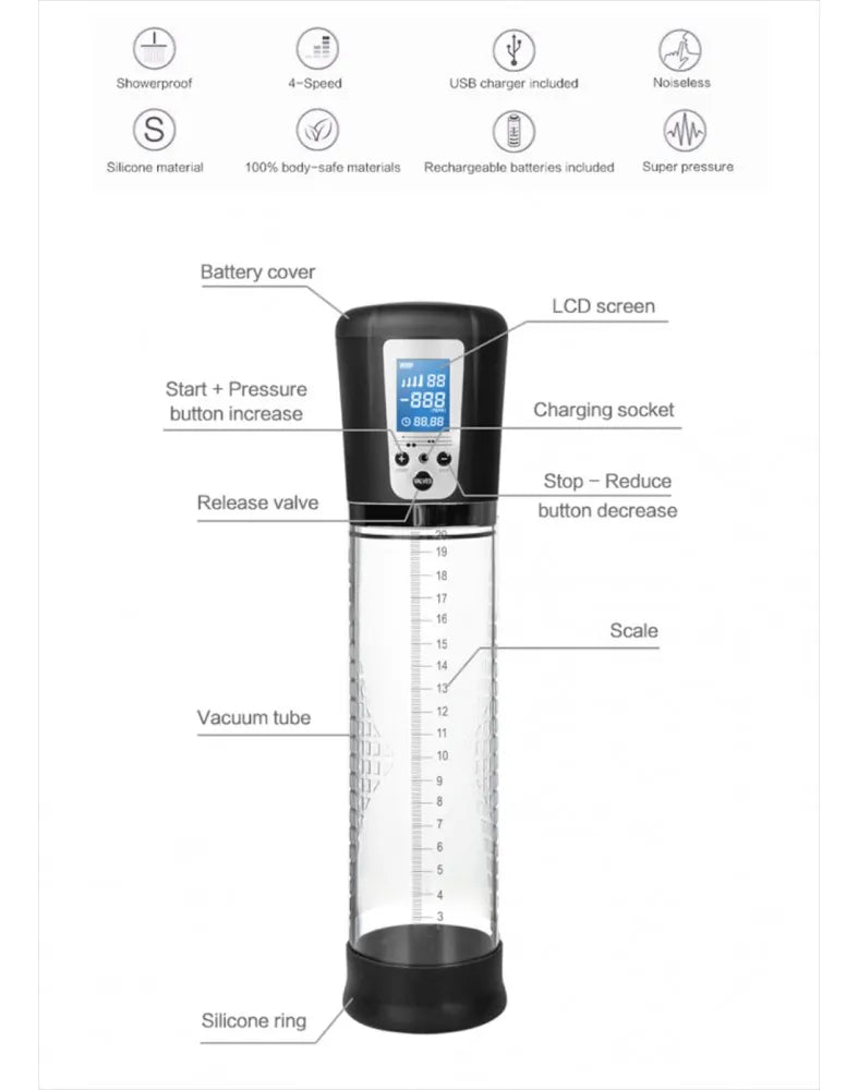 Se aconseja usar con un lubricante a base de agua para facilitar la entrada del pene en el cilindro. No uses vaselina ni lubricantes con petróleo ya que pueden estropear la funda del cilindro. Bombea de acuerdo a las instrucciones ya que se podrían producir daños en el pene. Si al usar la bomba de vacío sientes dolor, debes dejar de utilizarla. Limpia y seca la bomba antes y después de su uso para que se conserve óptimamente.